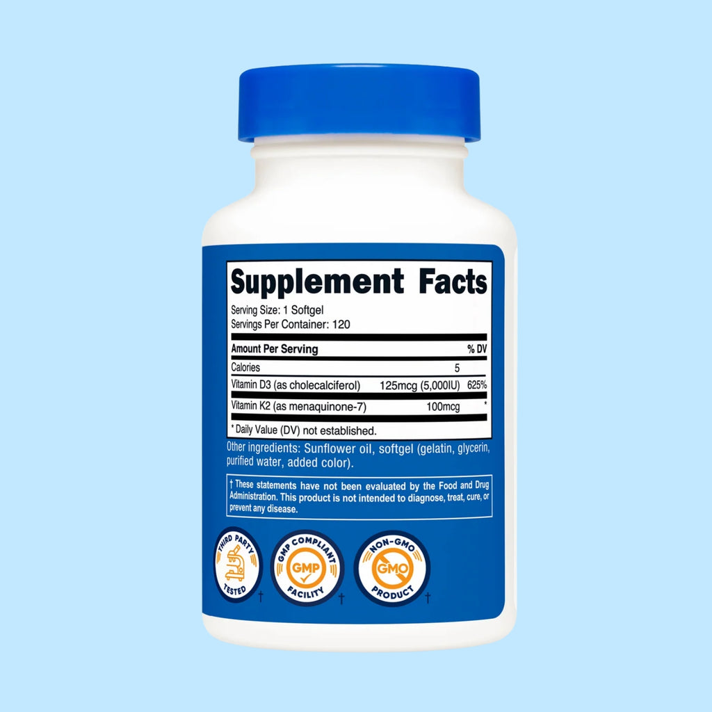 Vitamin D3, Vitamin K2, Softgel (Gelatin, Glycerin, Added Color, Purified Water) Sunflower Oil.