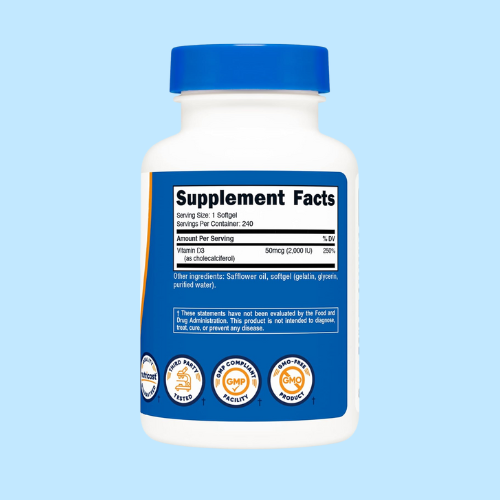 Las cápsulas blandas de vitamina D3 de Nutricost contienen 2000 UI (50 mcg) de vitamina D (colecalciferol) por porción.